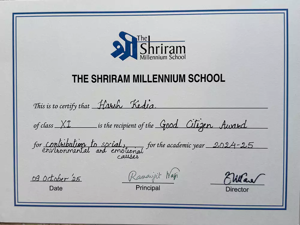 Honored with the Good Citizen Award by The Shriram Millennium School, Noida, for contributions to environmental, emotional, and social causes for 2 consecutive years.