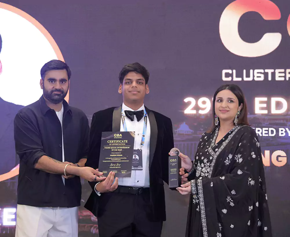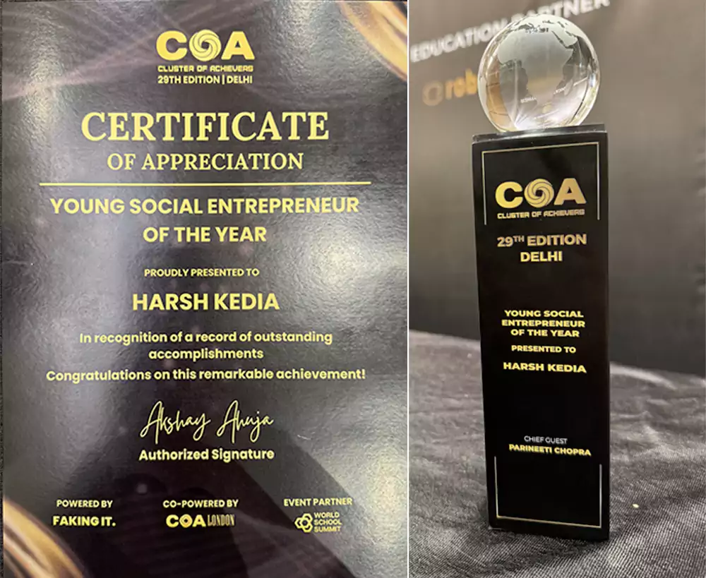Awarded Young Social Entrepreneur of the Year on 30th August by Cluster of Achievers. The award was presented by Bollywood Actress, Parineeti Chopra.