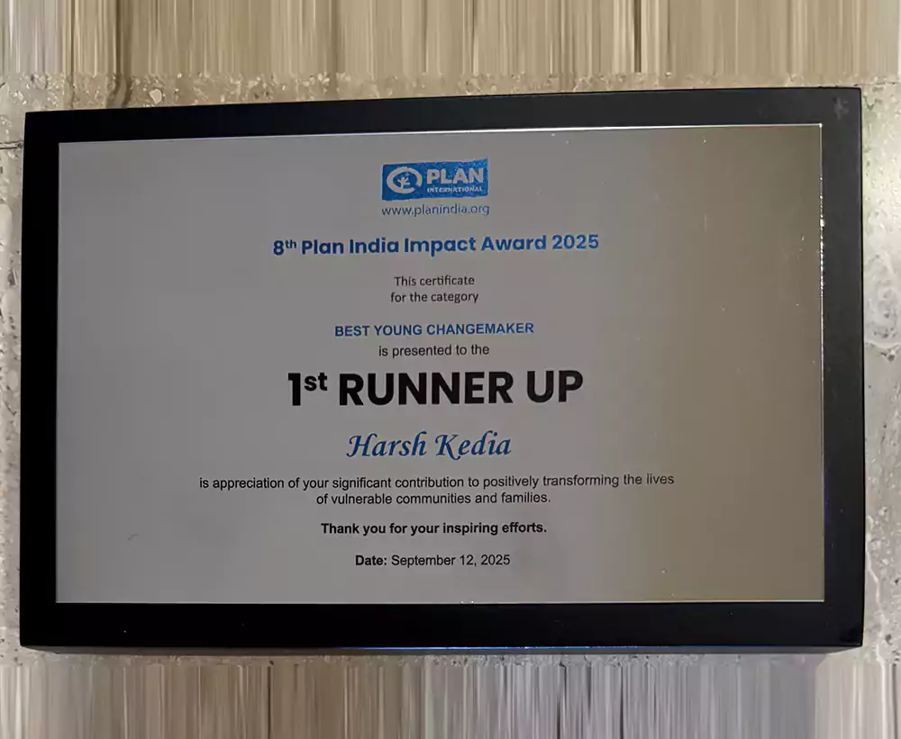 Awarded Best Young Changemaker – First Runner-Up at the Plan India Impact Awards 2025.